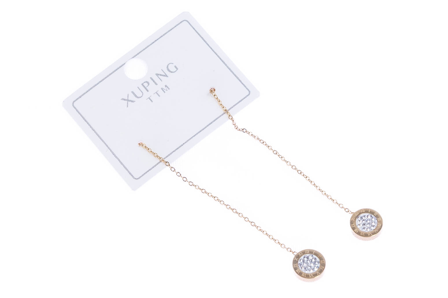 Eleganckie wiszące, złote kolczyki w kształcie okręgów ozdobione dżetami.