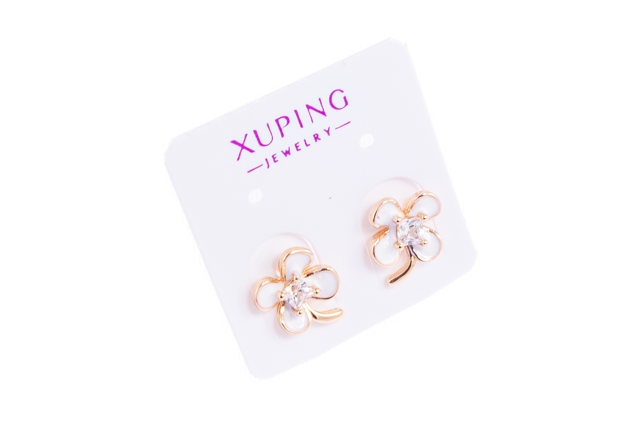 Eleganckie kolczyki w kształcie koniczynek. Kolczyki w złotym kolorze, ozdobione pięknie mieniącymi się kamieniami i białą emalią.Wymiary kolczyków: