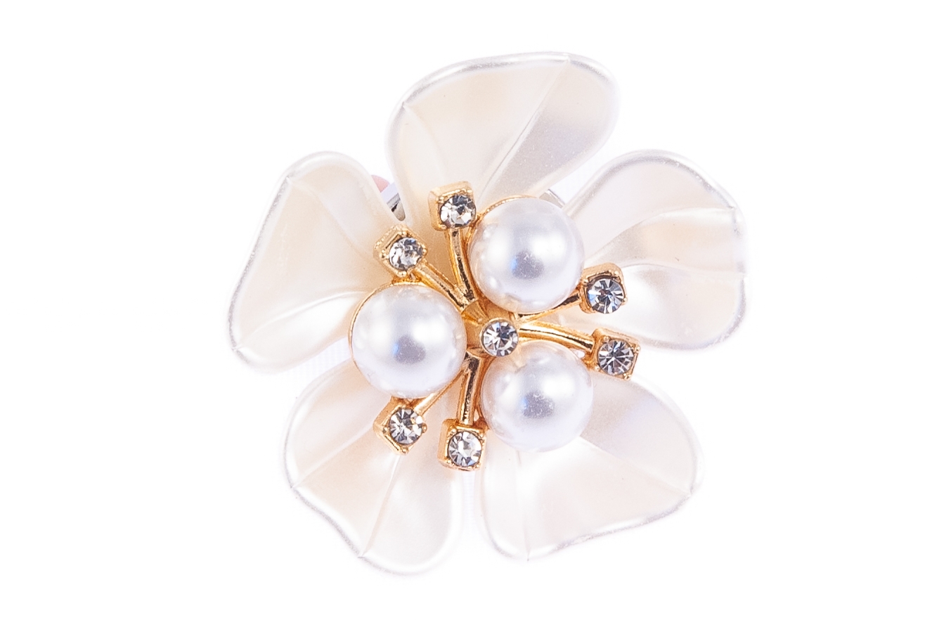 Elegancka ozdoba maskująca guzik mankietowy w kształcie kwiata. Biała ozdoba w oprawie w kolorze złotym, ozdobiona perłami i dżetami.Ozdoba doda szyku każdej stylizacji.