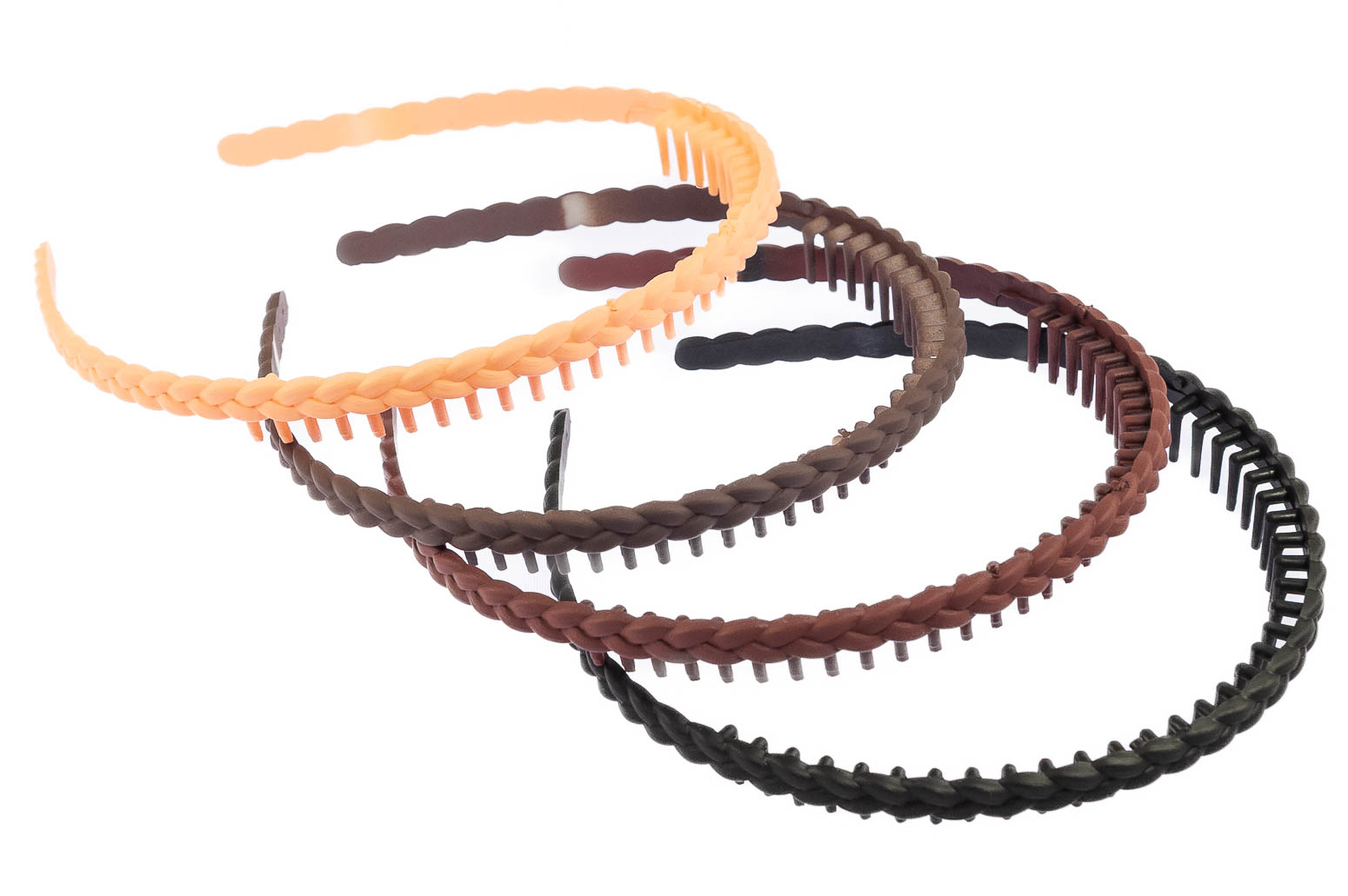 Opaska wykonana z trwałego materiału.Dzięki dodanemu grzebieniowi lepiej trzyma włosy.Zestaw składa się z czterech kolorów: czarny, beżowy, jany i ciemny brązowy.