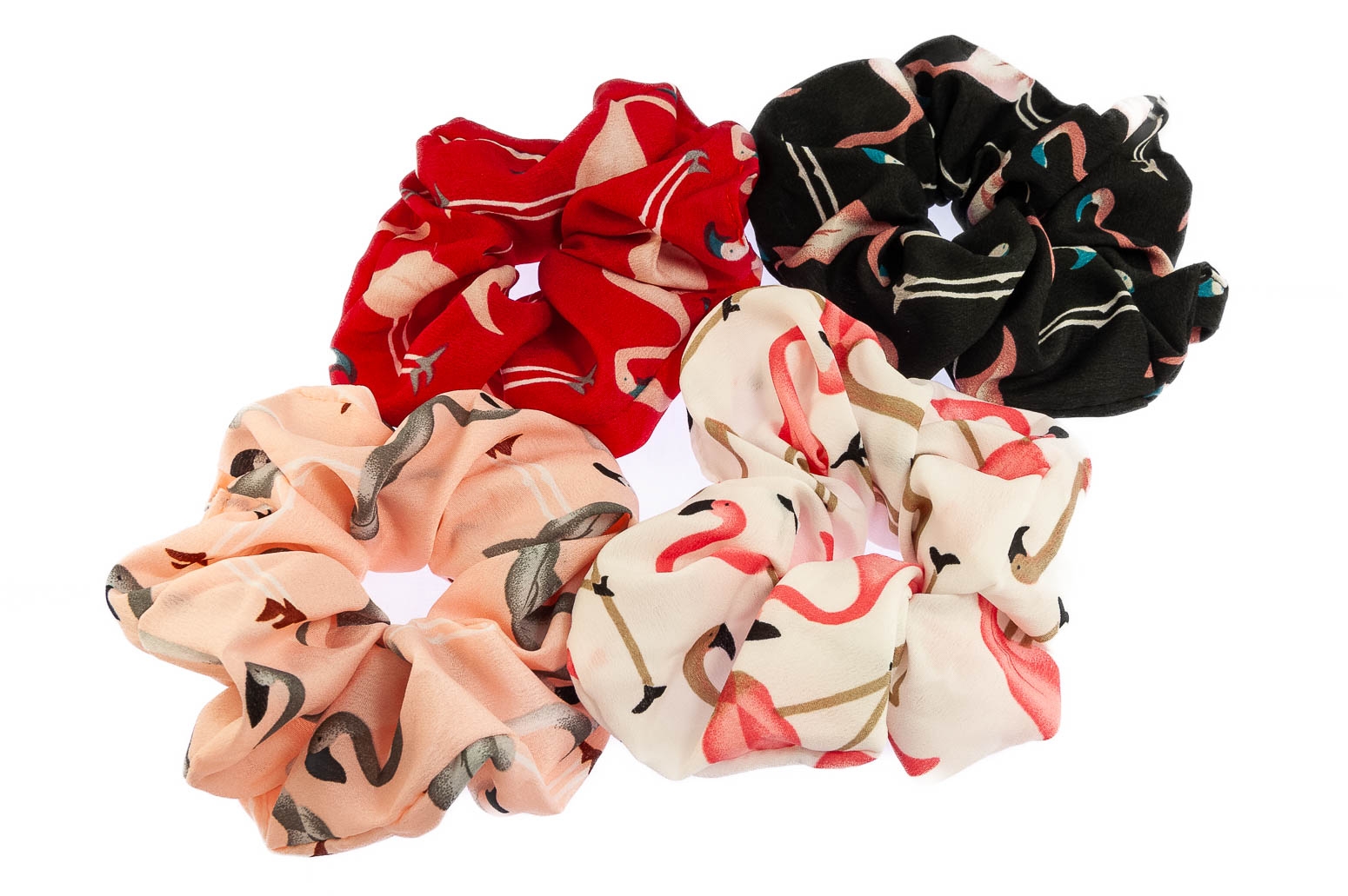 Eleganckie owijki ozdobione nadrukowanymi flamingami, są wytrzymałe i dobrze trzymają włosy.