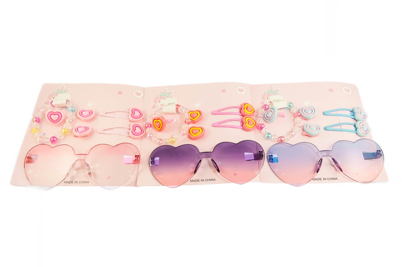 Zestaw składa się z pierścionka, bransoletki, gumek, spinek i okularów. Zestaw ozdobiony jest serduszkami.