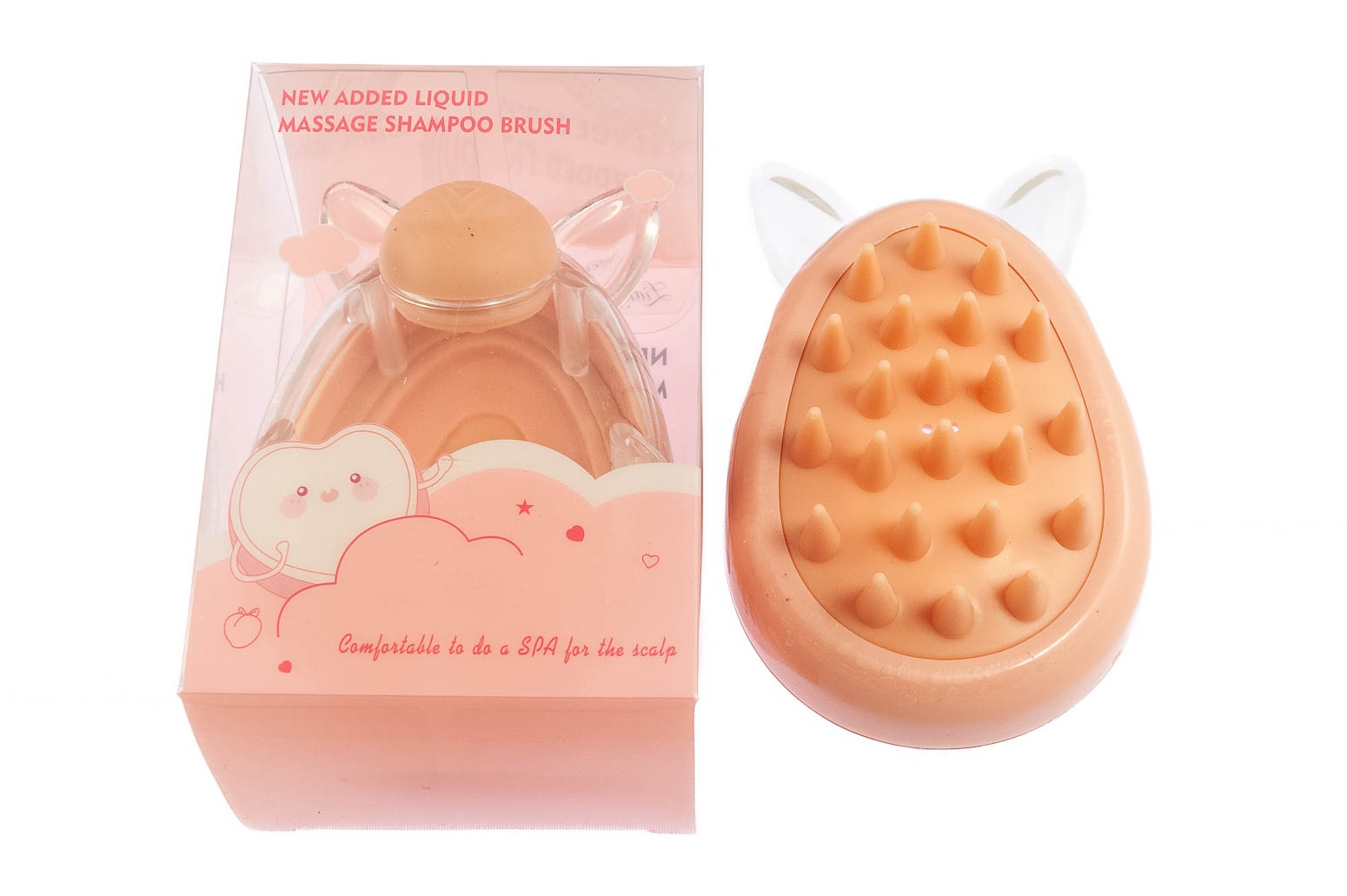 Masażer do skóry głowy, który posiada dozownik płynu.Przedmiot jest w kolorze jasno różowym.