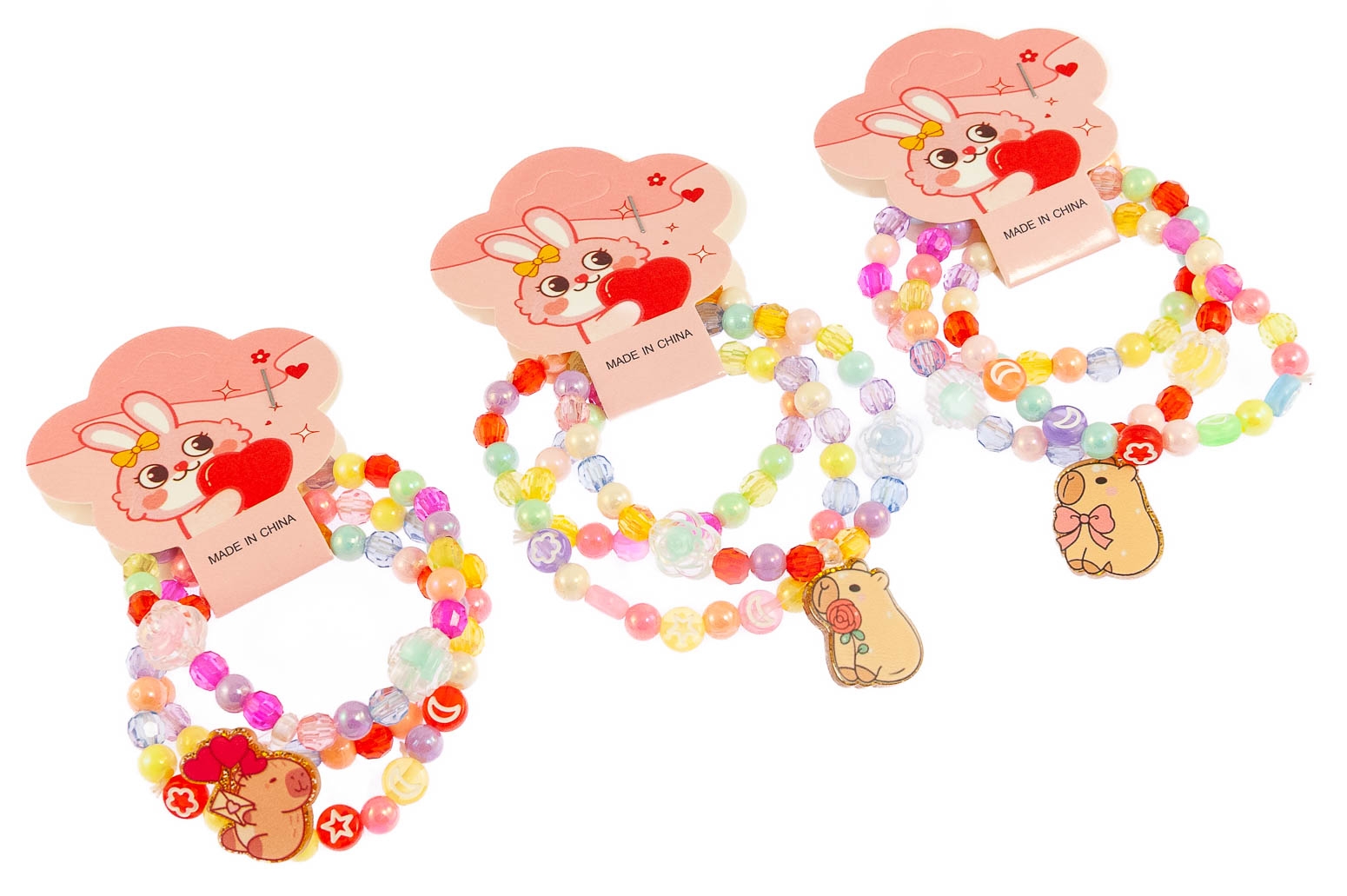Urocza bransoletka wykonana z koralików i przywieszki w kształcie kapibary.Zestaw składa się z trzech wzorów.
