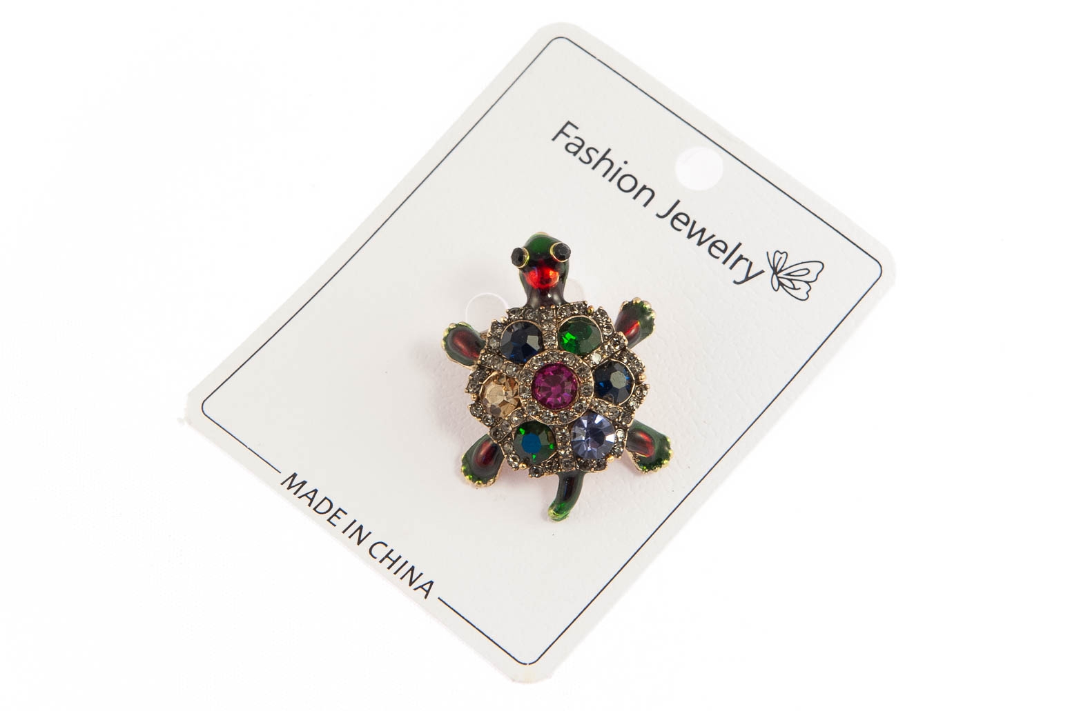 Elegancka broszka w kształcie żółwia. Przywieszka w kolorze złotym, ozdobiona szlifowanymi kamieniami.