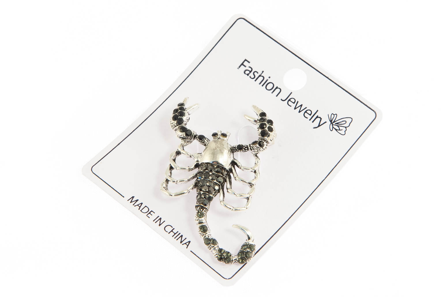 Elegancka broszka w kształcie skorpiona. Przywieszka w kolorze srebrnym, ozdobiona szlifowanymi kamieniami.