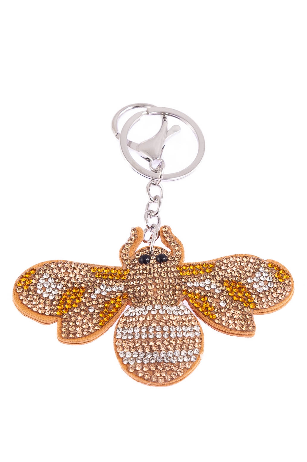 Elegancki brelok w kształcie osy, ozdobiony dżetami w kolorze żółtym i beżowym.Brelok idealnie nada się na prezent, który ucieszy każde dziecko.