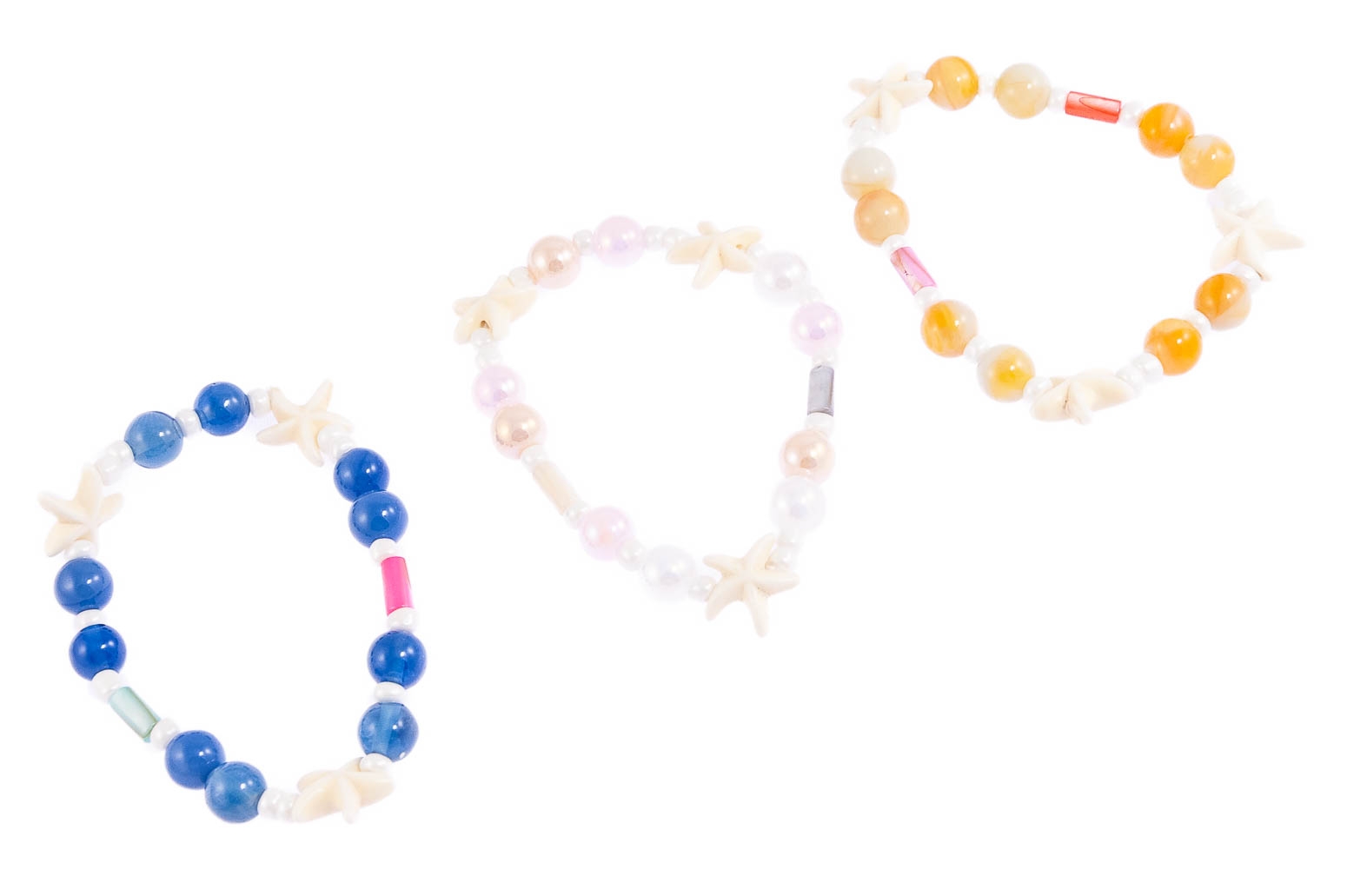 Elegancka bransoletka wykonana z koralików i rozgwiazd.Zestaw składa się z trzech kolorów: granatowy, różowy i żółty.