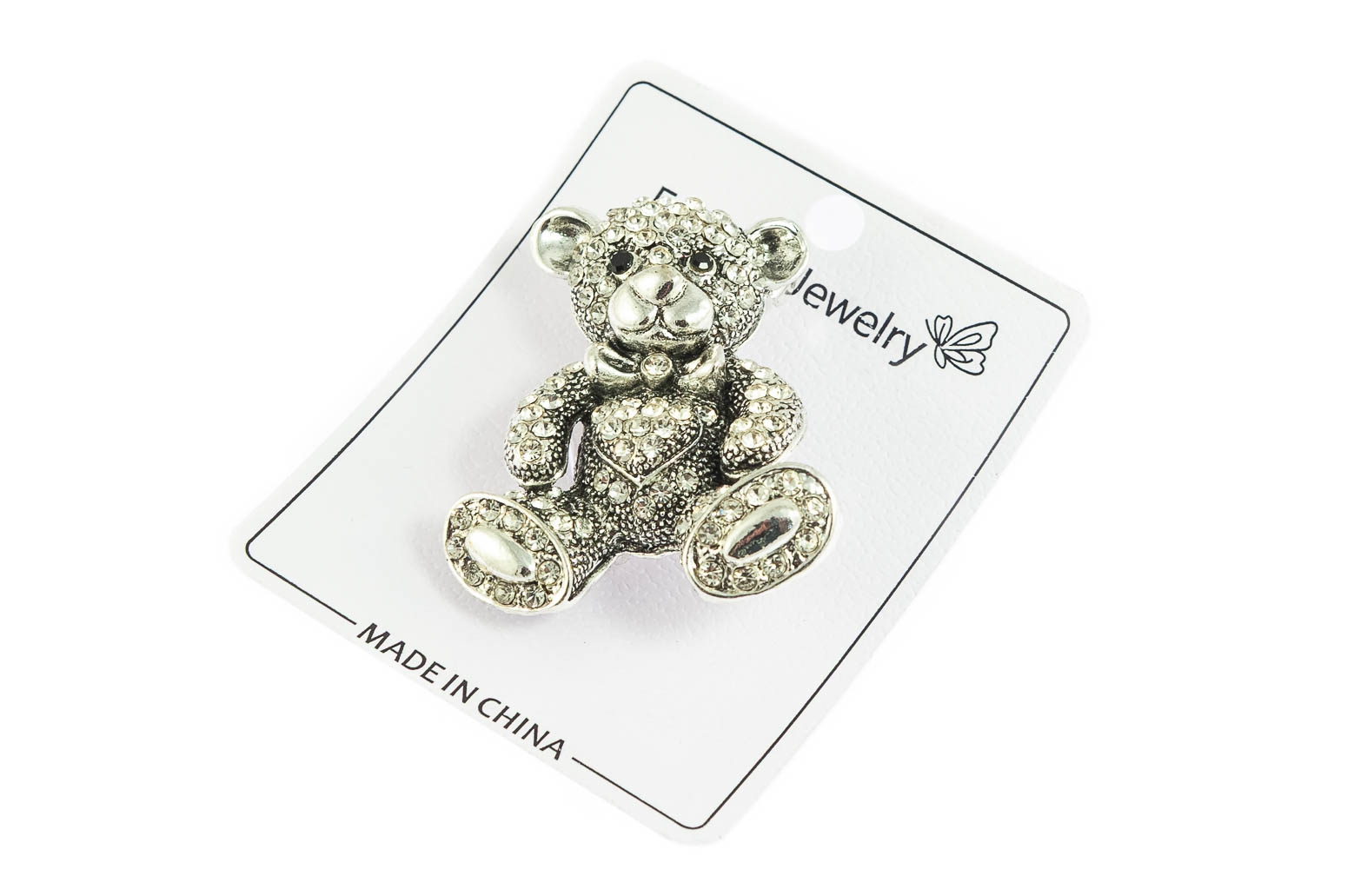 Elegancka broszka w kształcie misia. Przywieszka w kolorze srebrnym, ozdobiona szlifowanymi kamieniami.Ozdoba doda szyku każdej stylizacji.