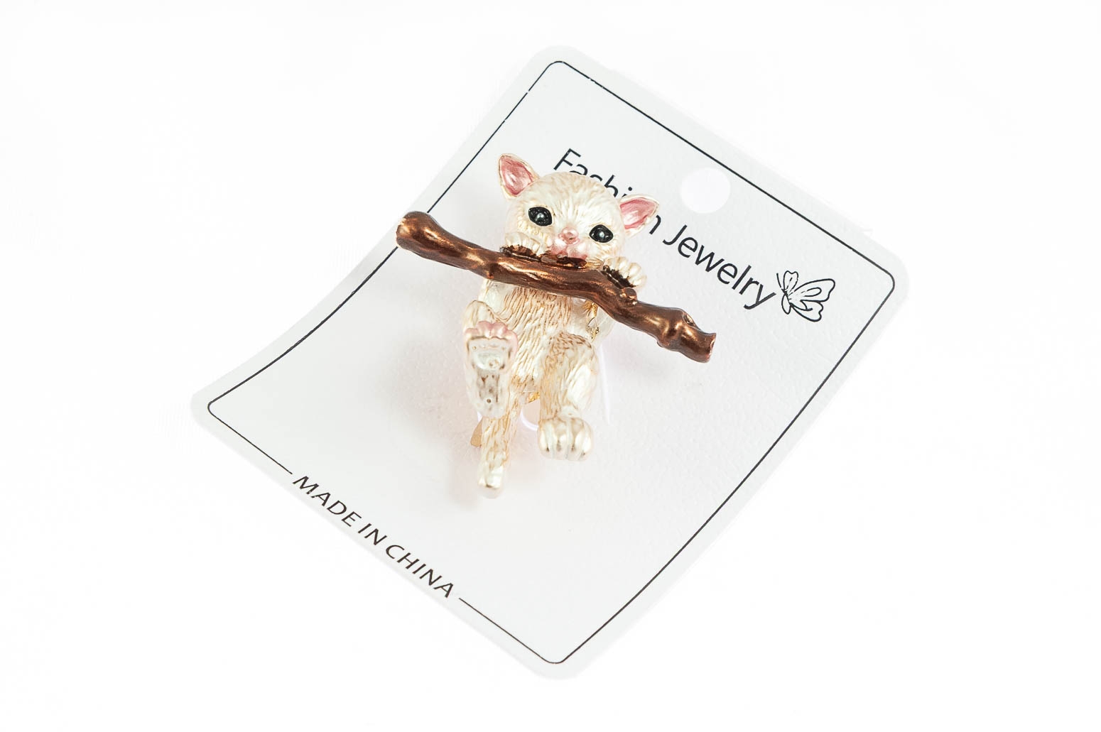 Elegancka broszka w kształcie kota. Przywieszka ozdobiona białą i brązową emalią.Ozdoba doda szyku każdej stylizacji.