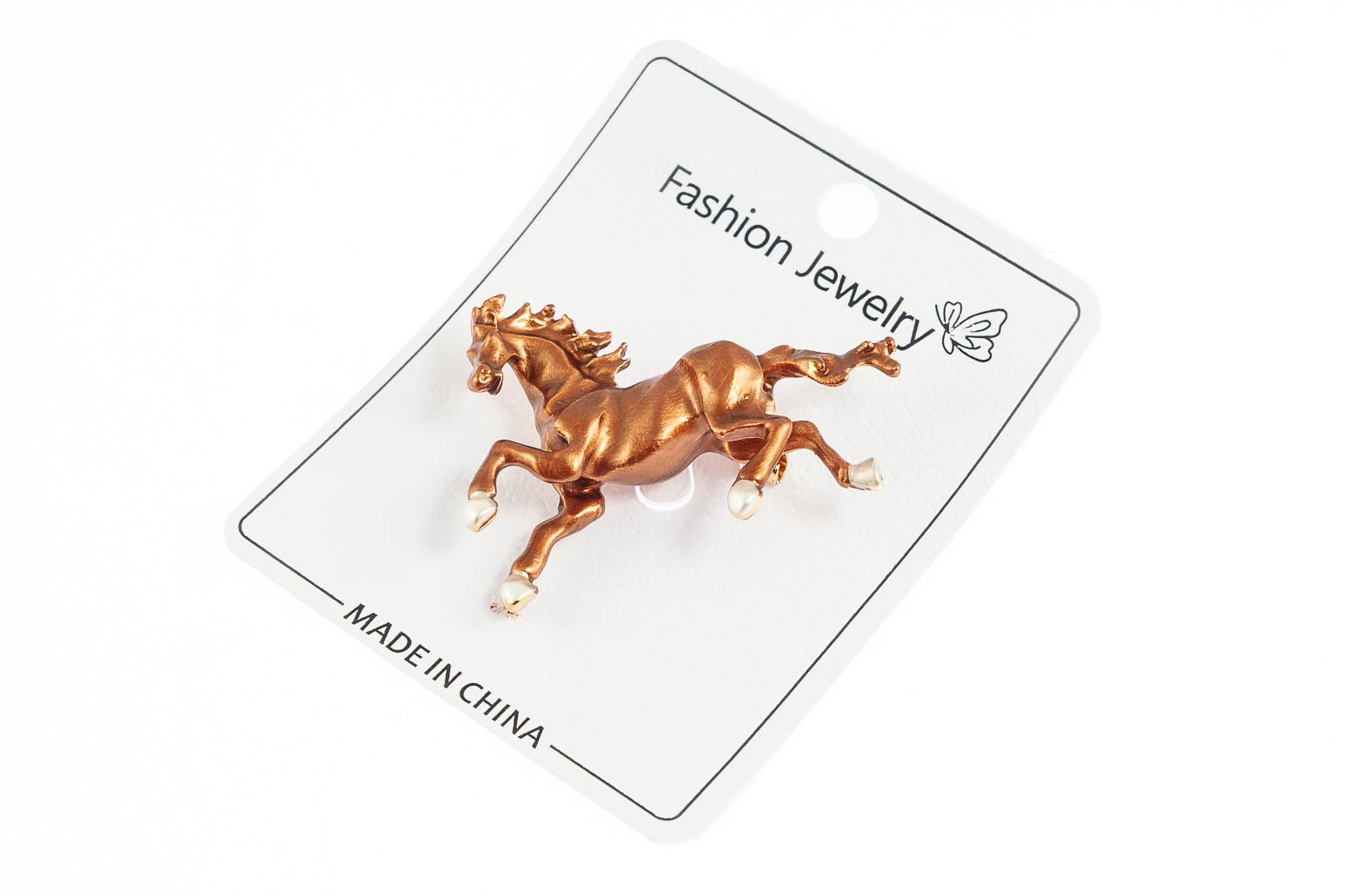Elegancka broszka w kształcie konia. Przywieszka ozdobiona białą i brązową emalią.