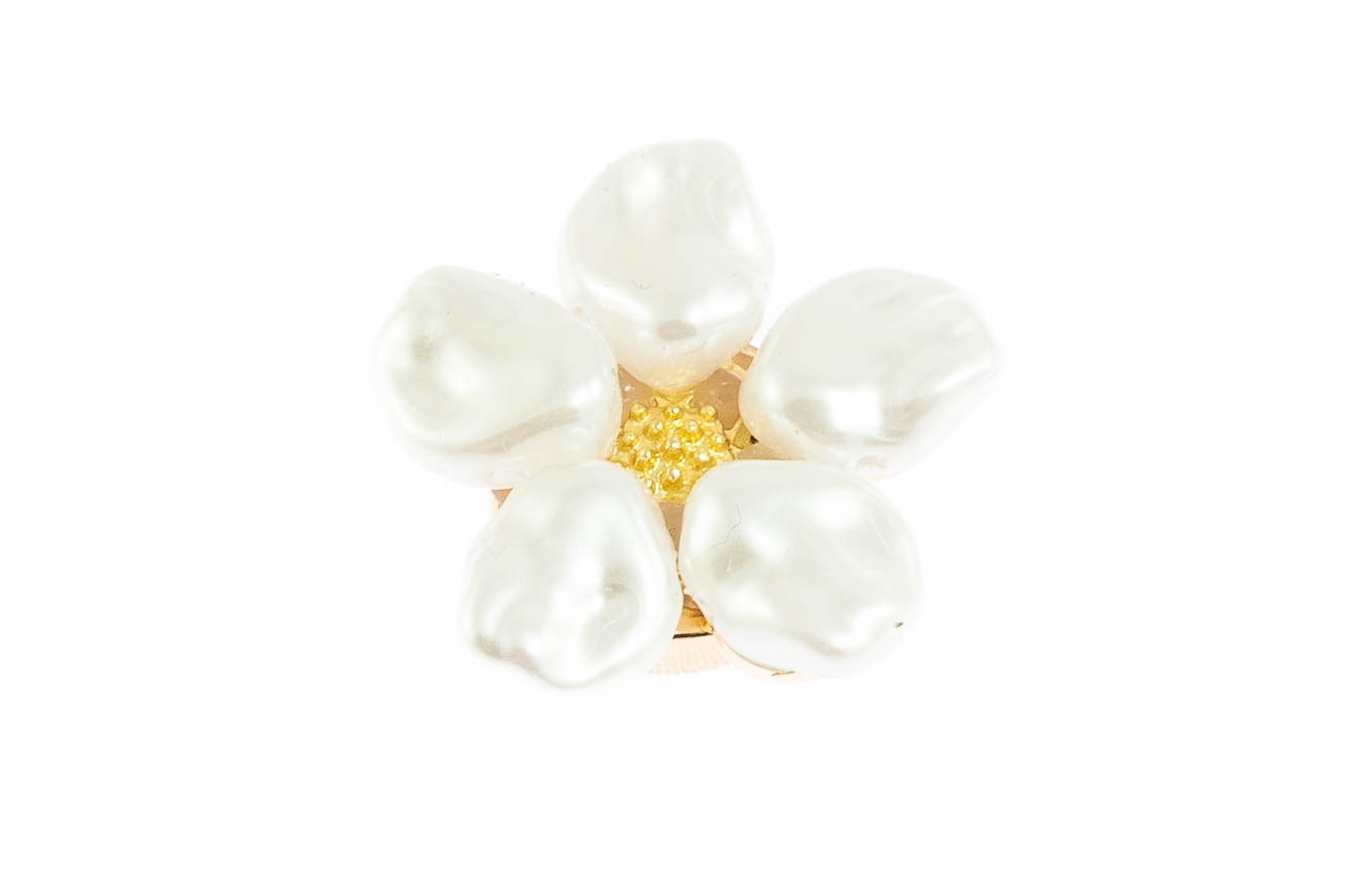 Elegancka ozdoba maskująca guzik mankietowy w kształcie kwiatka. Przypinka w kolorze złotym, ozdobiona perłami.