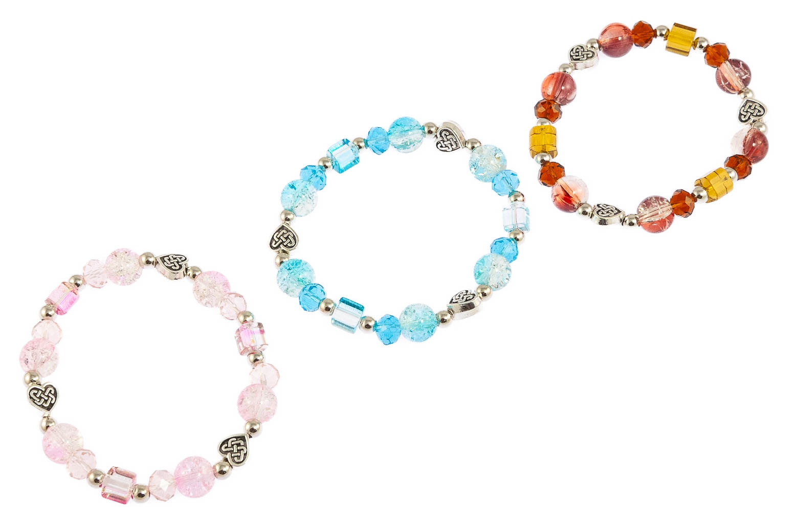 Elegancka bransoletka wykonana ze szlifowanych koralików i koralików z pękanego szkła.Zestaw składa się z trzech kolorów: brązowy, różowy i błękitny.