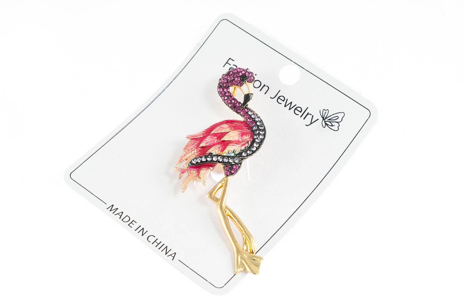 Elegancka broszka w kształcie flaminga. Przywieszka w kolorze złotym, ozdobiona szlifowanymi kamieniami i kolorową emalią.