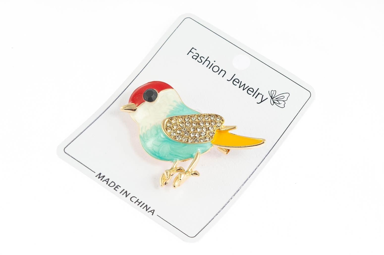 Elegancka broszka w kształcie ptaszka. Przywieszka w kolorze złotym, ozdobiona szlifowanymi kamieniami i kolorową wmalią.